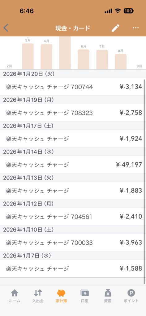 普段は現金ではなくすべて楽天Payでの支払いでその楽天キャッシュのチャージが大半です。