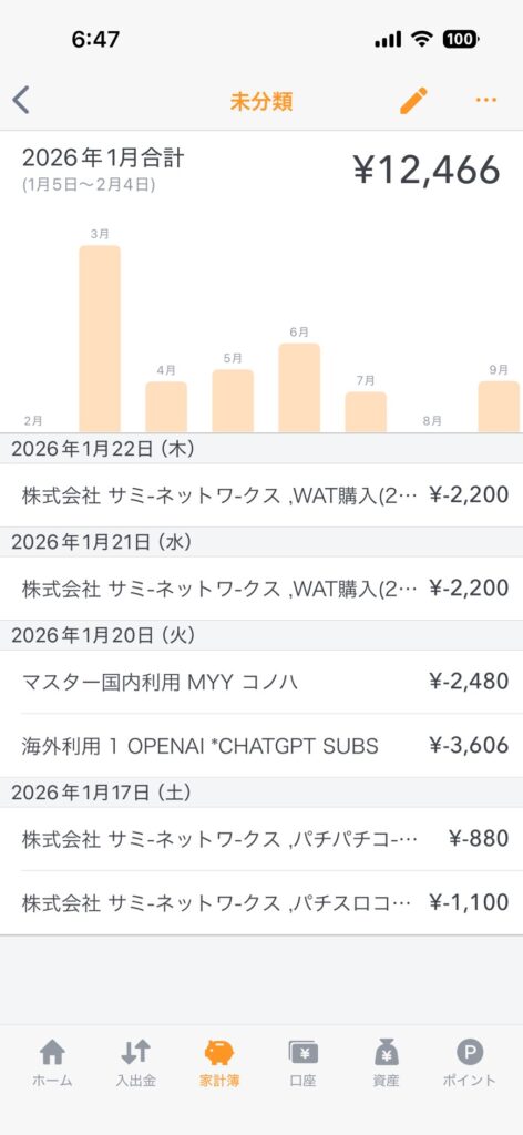 私はマネーフォワードMEを有料で利用していますので、クレカの連携も早くなり数日前の状況を把握できます。